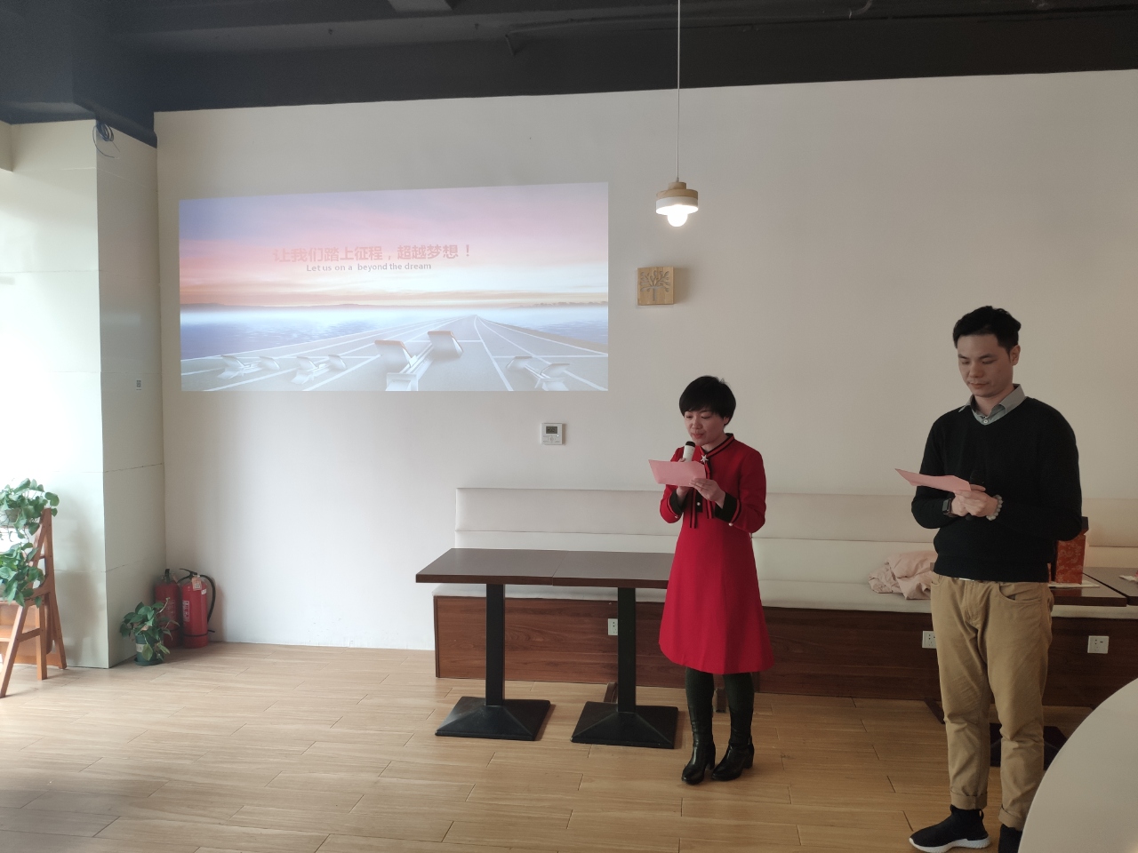 排练时,我和搭档一遍遍地默读各自的主持串词,熟悉会议流程。因为写出来的文字念出来时会存在些许差异,书面语言正式严谨,但有时缺乏活力;而口语通俗易懂、更接地气,我们需要将部分书面语言转换成活泼、灵动的口语,以调节会议既正式又不乏轻松的气氛。所以我们在简单熟悉流程后开始分角色读稿,并大声朗读出来。等到主持串词定稿后,我们开始正式彩排。一次又一次地练习,一次又一次的地改进,从紧张到放松,从生疏到熟练,从错漏百出到磨合得越来越顺畅。