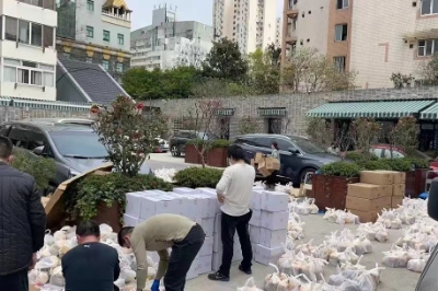冠生园连夜到奉贤仓库调集货源,召集公司总部人员成立40多人的志愿者突击队,拉货卸货分装送货,平时办公室的坐班族瞬间人人秒变搬运工,1030箱的蜂蜜和桃酥饼干按要求分成3128份,大家汗流浃背但都很欣慰,觉得能为抗疫保供尽自己的绵薄之力。