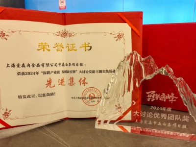 上海爱森申森白条项目组荣获2024年OK138太阳集团“深耕产业链 发展新引擎”大讨论党建主题实践活动先进集体。